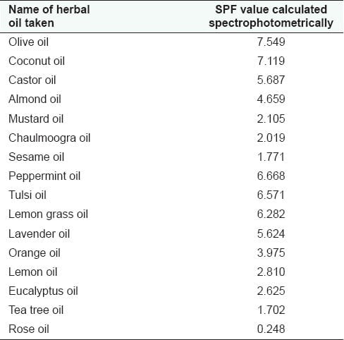 Jest wiele olejów roślinnych, które wykazują potwierdzone – choć niewielkie – zdolności absorbcji promieniowania UVA i UVB. Parametry wahają się tu zazwyczaj od 1 do 8 SPF, zatem mówimy o ochronie niskiej.